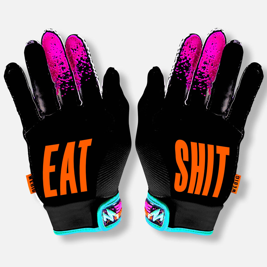 • EAT SHIT is printed in tacky silicone on the palms to add some extra grip
